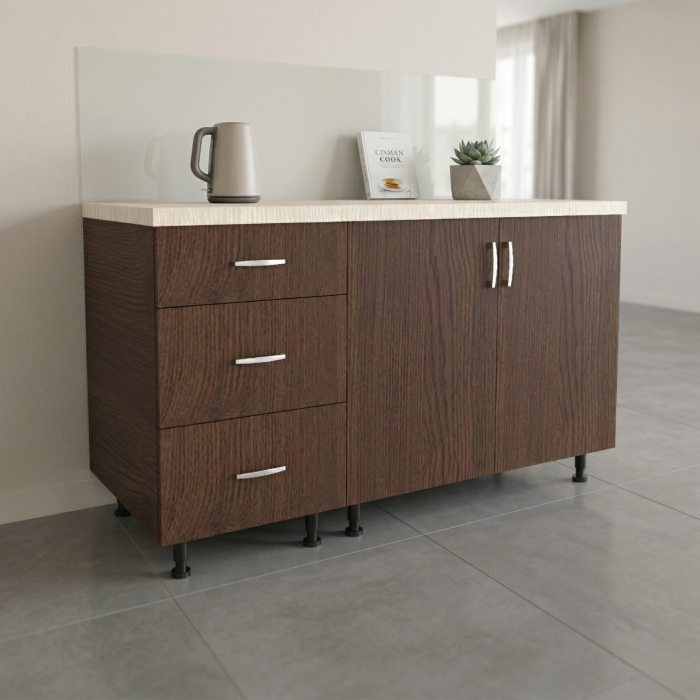 Corpul Inferior 120 cm bucatarie WENGE face parte dintr-o colectie de corpuri modulare, cu un design atent elaborat, menite sa ofere o combinatie armonioasa intre estetica si functionalitate. Aceste corpuri de bucatarie au fost concepute cu grija pentru a optimiza spatiul de depozitare, oferind numeroase rafturi si sertare pentru a organiza eficient toate ustensilele si accesoriile necesare in bucatarie.
