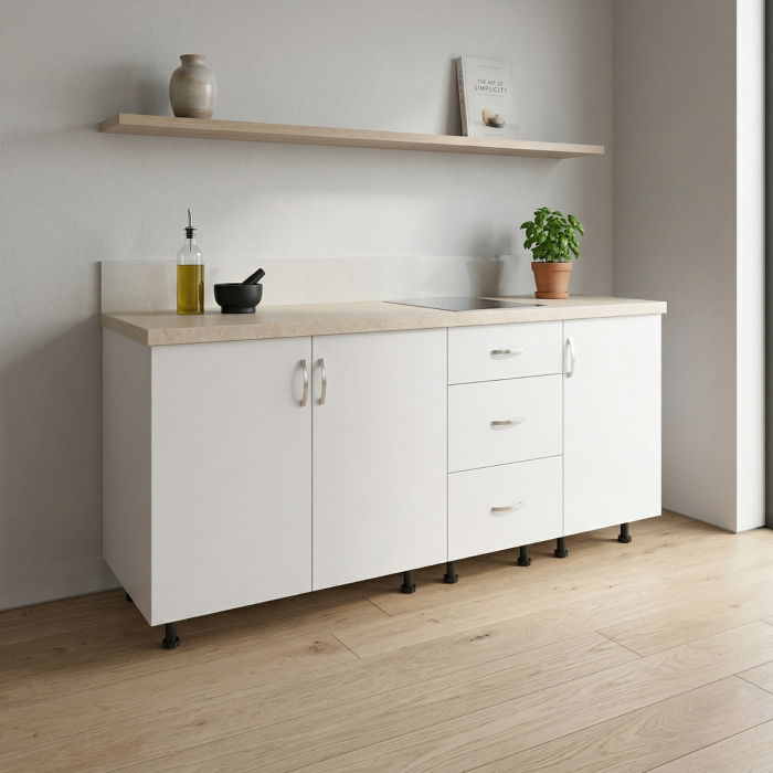 Corpul Inferior 160 cm bucatarie ALB face parte dintr-o colectie de corpuri modulare, cu un design atent elaborat, menite sa ofere o combinatie armonioasa intre estetica si functionalitate. Aceste corpuri de bucatarie au fost concepute cu grija pentru a optimiza spatiul de depozitare, oferind numeroase rafturi si sertare pentru a organiza eficient toate ustensilele si accesoriile necesare in bucatarie.