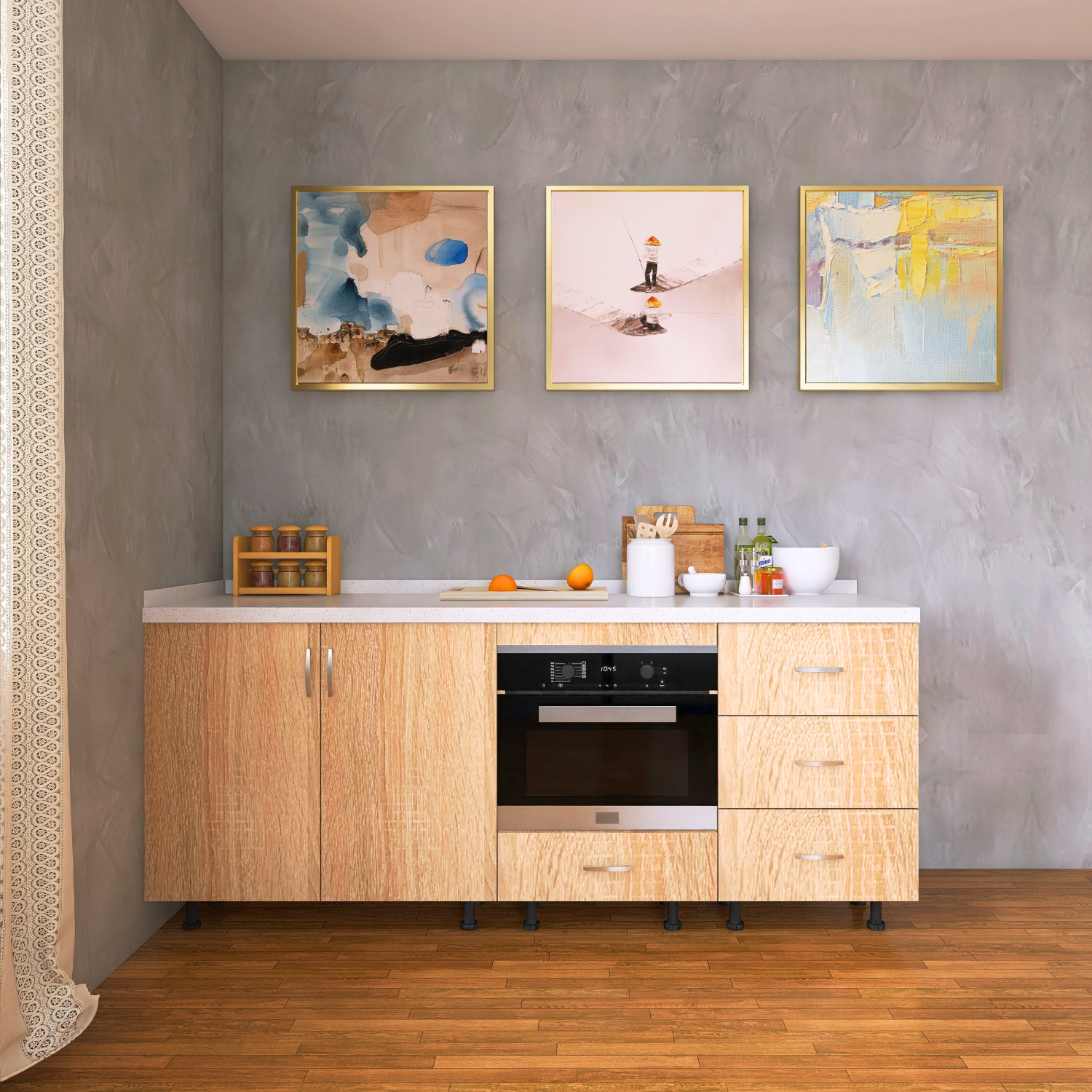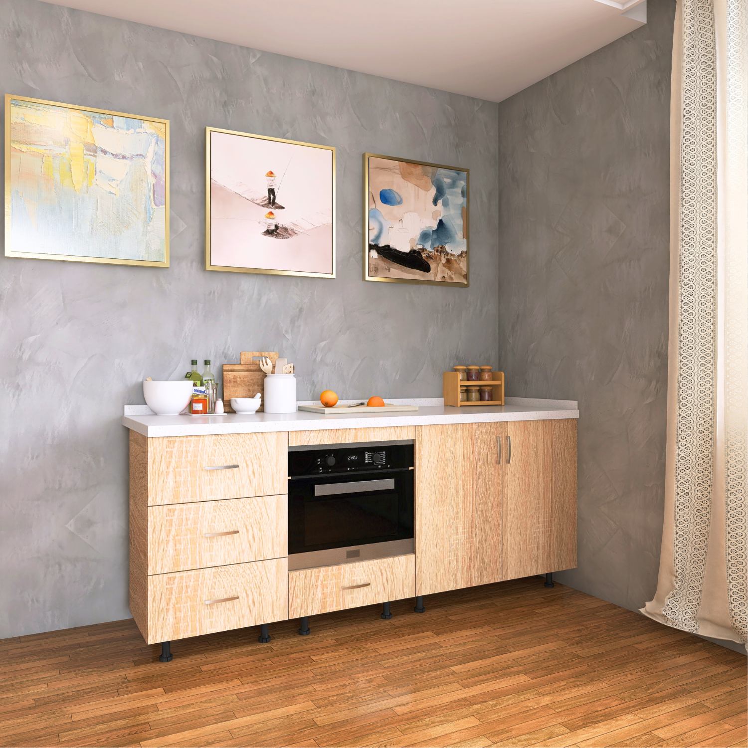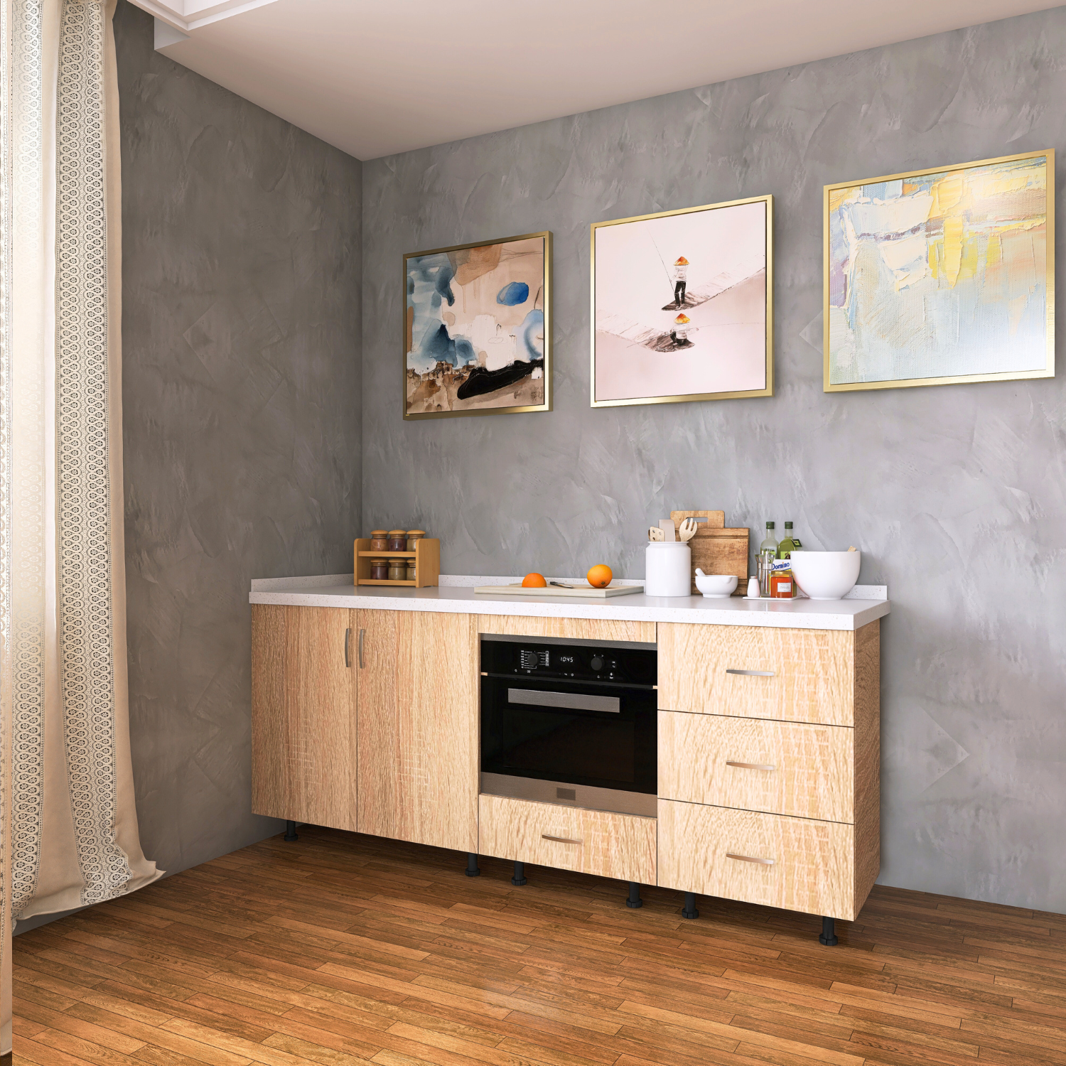 ✔ Design Stejar Sonoma – nuanță caldă și naturală, ușor de integrat în orice bucătărie.