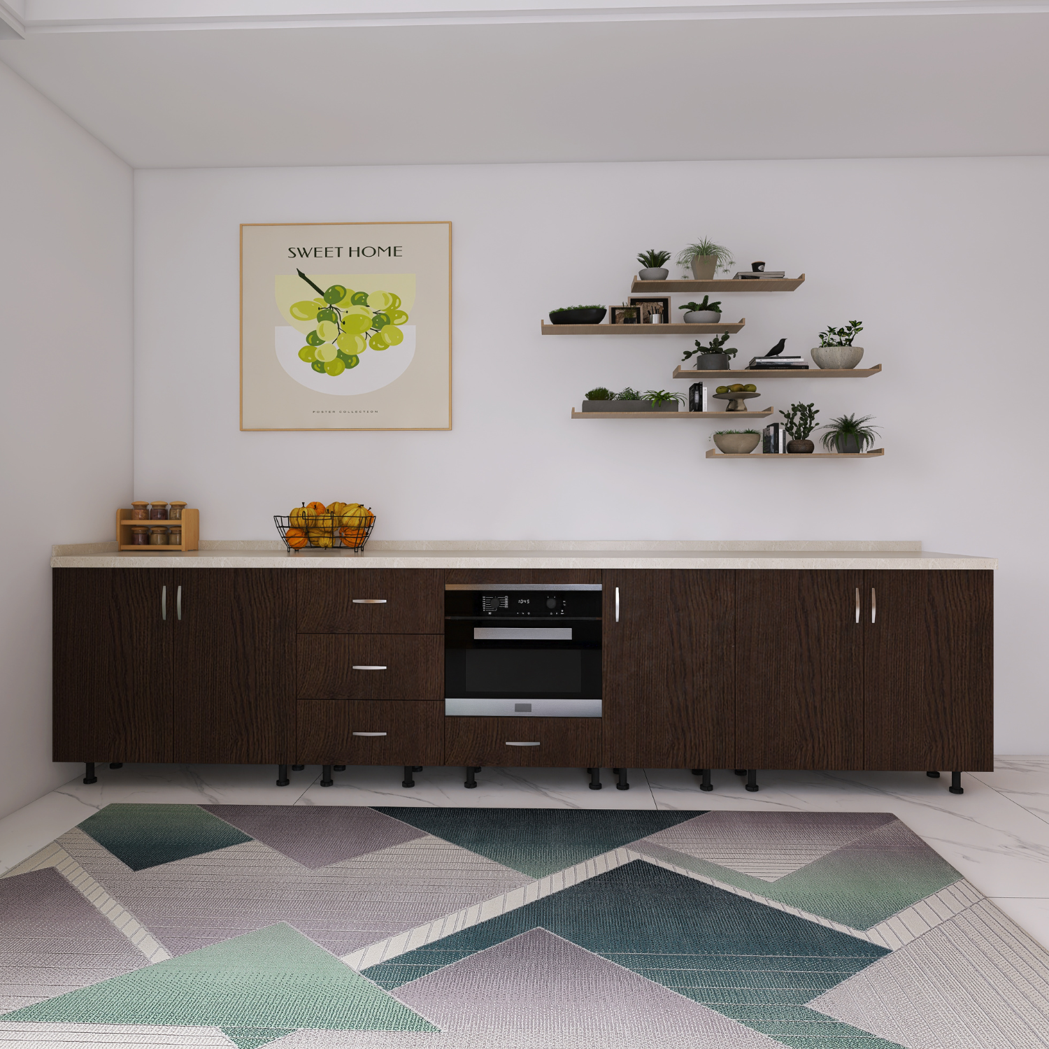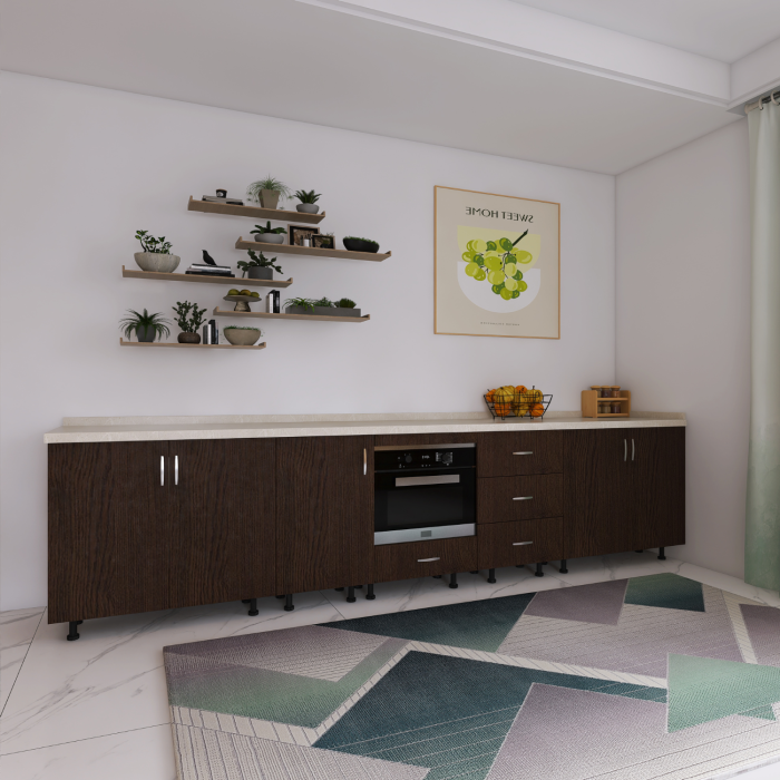 Corpul Inferior 300 cm bucatarie WENGE face parte dintr-o colectie de corpuri modulare, cu un design atent elaborat, menite sa ofere o combinatie armonioasa intre estetica si functionalitate. Aceste corpuri de bucatarie au fost concepute cu grija pentru a optimiza spatiul de depozitare, oferind numeroase rafturi si sertare pentru a organiza eficient toate ustensilele si accesoriile necesare in bucatarie.