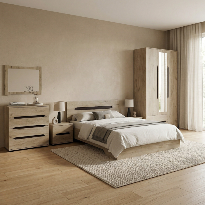 transforma-ti dormitorul intr-un spatiu modern si bine organizat cu acest set complet, realizat din PaL melaminat rezistent, usor de intretinut si durabil in timp. Designul simplu si practic se potriveste perfect in orice locuinta, oferind atat confort, cat si spatiu generos de depozitare.